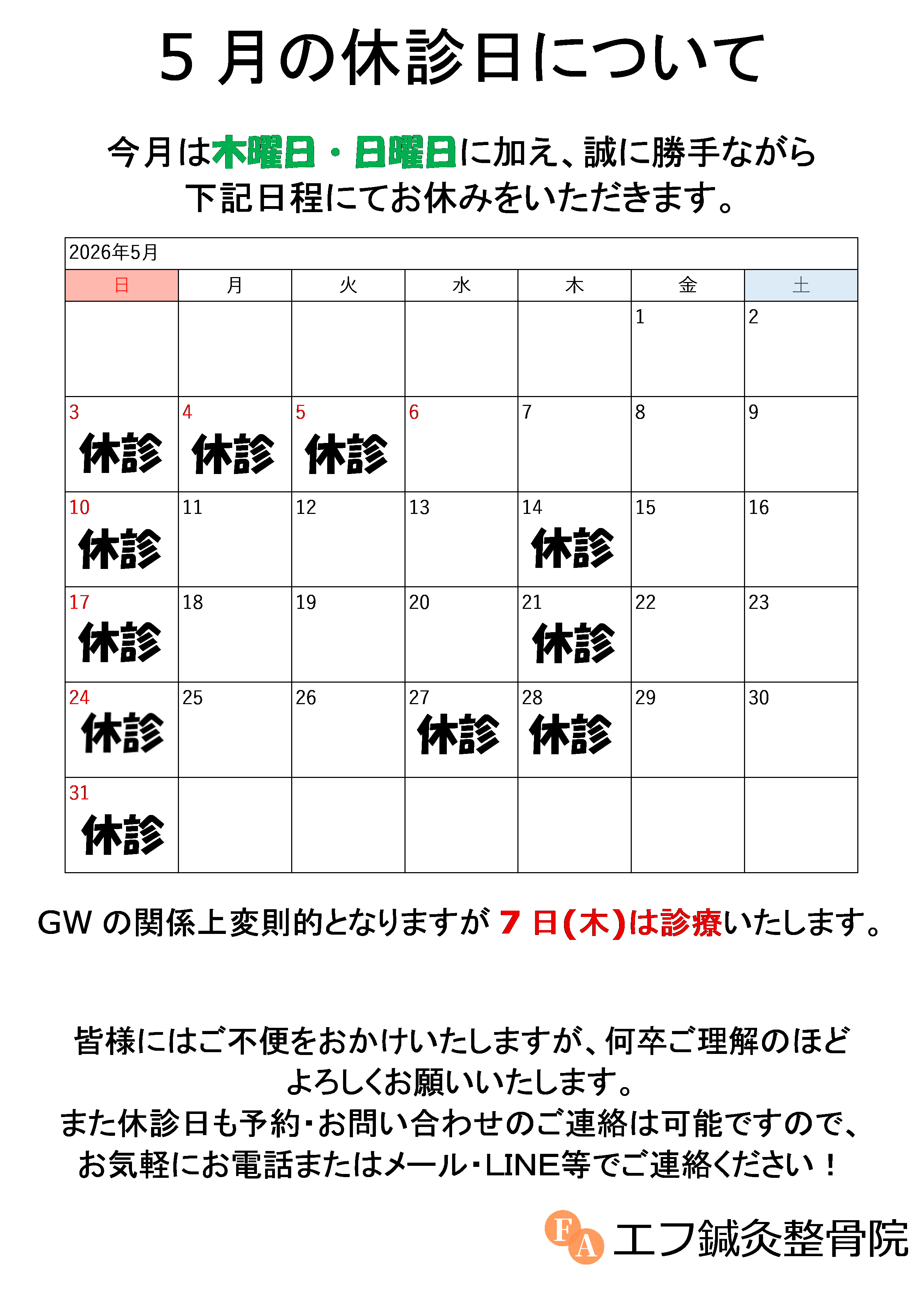 5月の休診日及びGWについてのご案内です